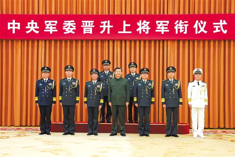 晋衔仪式在嘹亮的军歌声中结束。随后,习近平等领导同志同晋升上将军衔的军官合影。